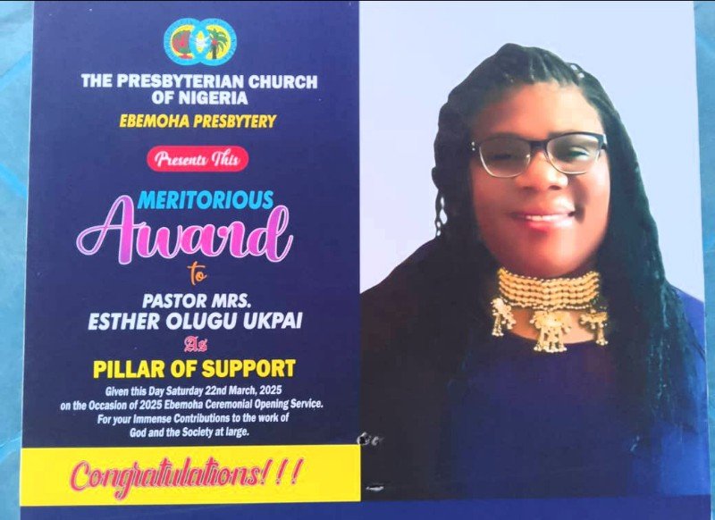 The Presbyterian Church of Nigeria, Ebemoha Presbytry, recently bestowed a special honor on Mrs. Esther Olugu Ukpai as “Pillar of Support”, in recognition of her outstanding contributions to the Church, Community and Humanity at large.